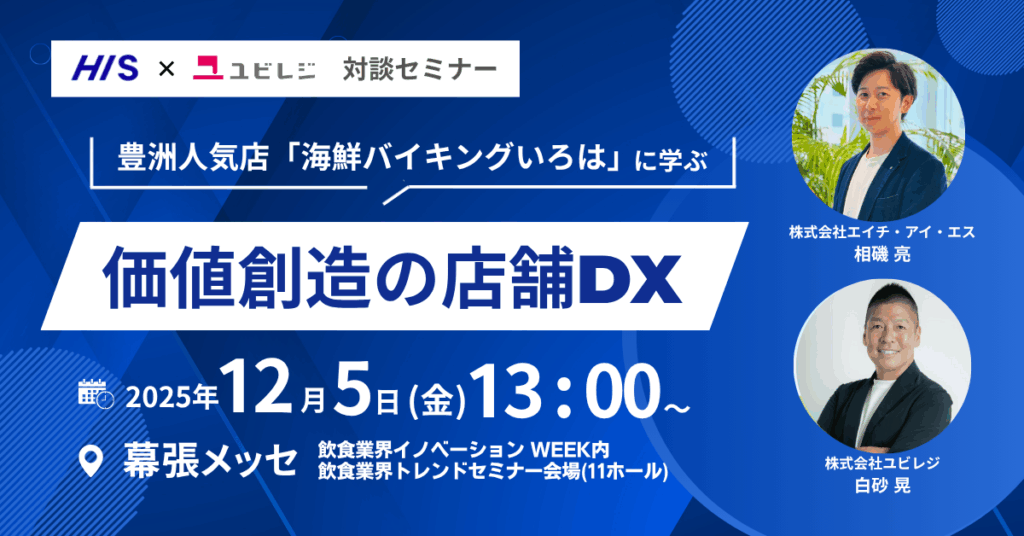 本セミナーでは、旅行事業で培った“体験設計”のノウハウを活かし、豊洲 千客万来で「海鮮バイキング いろは」を展開し、今年7月に東京ドームシティに2号店をオープンした 株式会社エイチ・アイ・エス 相磯 亮 氏 と、クラウドPOSレジ「ユビレジ」を15年にわたり提供する株式会社ユビレジ取締役 白砂 晃が登壇。「お客様に選ばれる店舗とは?」をテーマに、現場のリアルな成功事例を交えながら、店舗DXがもたらす体験価値の進化について語ります。